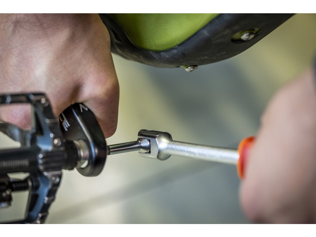 S klíčem na pedály s kloubem je sundání nebo montáž pedálů snazší než kdy dříve. K dispozici je ve velikostech 6 a 8 šestihranných klíčů, které pokrývají nejběžnější rozhraní pro montáž široké škály pedálů.
